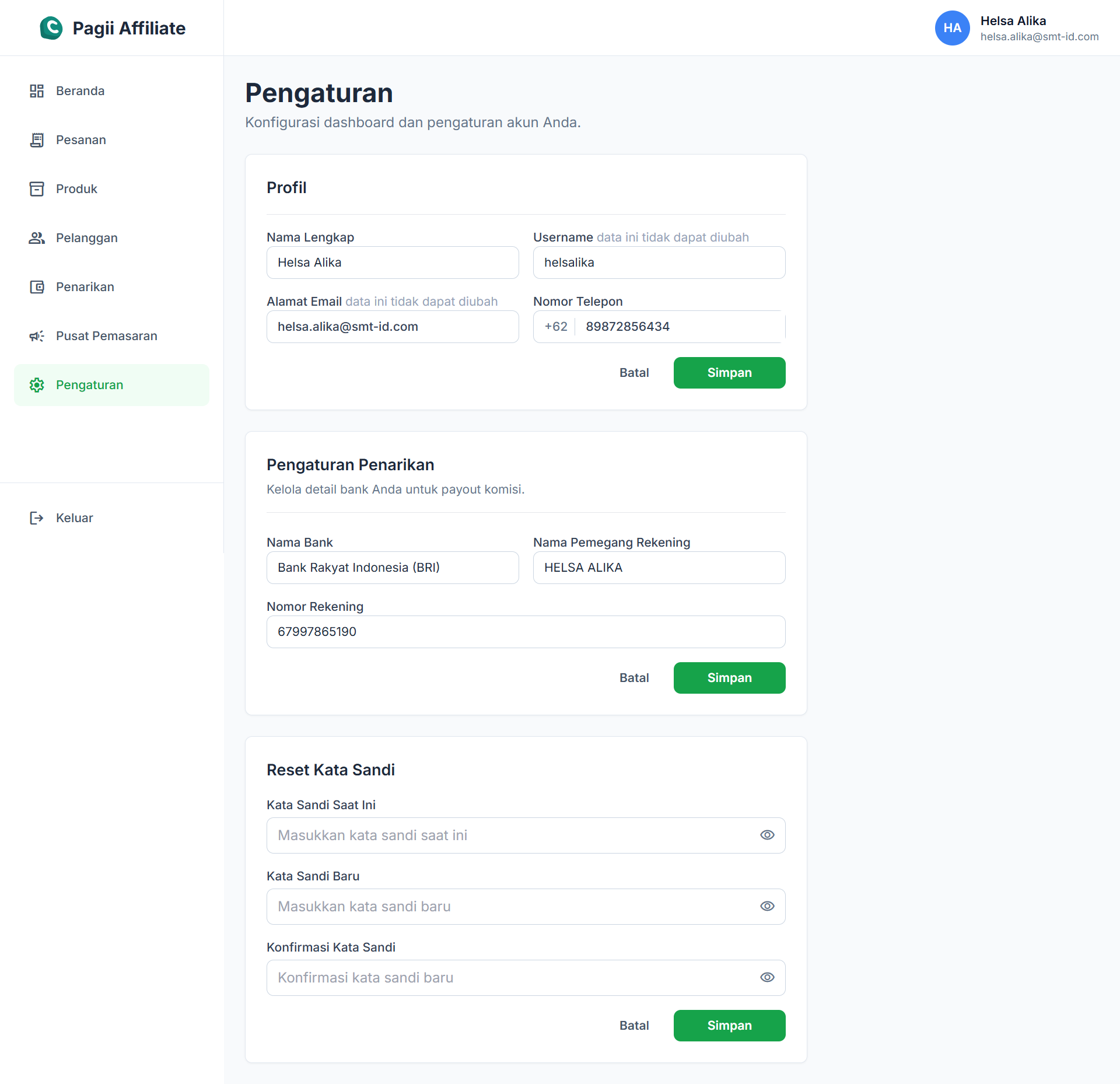 Pusat informasi utama untuk memantau performa, link affiliate, komisi, serta pencairan dana.